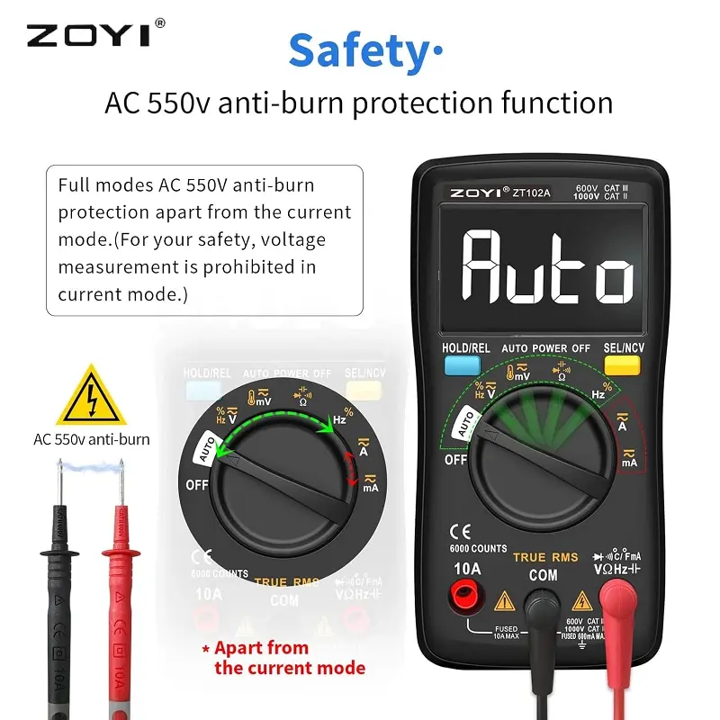 The ZOYI ZT-102A Auto-Ranging Digital Multimeter is a high-performance, compact, and intelligent measuring instrument designed for professionals, technicians, and hobbyists who need precise and dependable electrical measurements. With a robust feature set, including True RMS measurement, auto-ranging, and a 6000-count display, this versatile multimeter is ideal for diagnosing, testing, and troubleshooting a wide range of electrical and electronic systems.