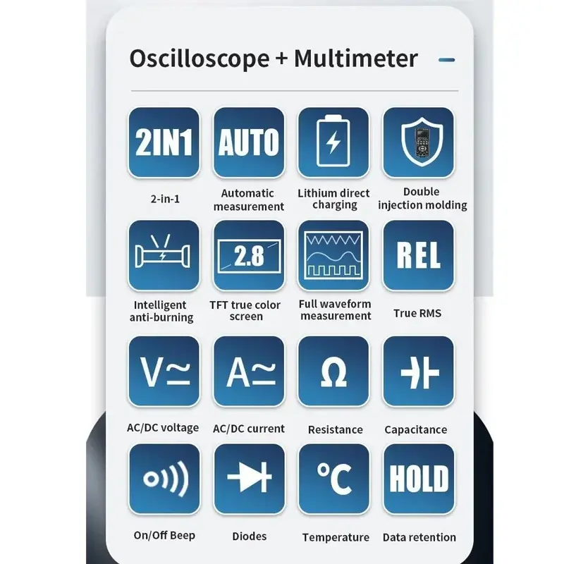 Equipped with a built-in signal generator, this device can output a wide range of waveforms ? including sine, square, triangle, and sawtooth signals. This function is perfect for testing, simulation, and educational applications, eliminating the need for multiple separate instruments. Users can easily generate test signals to validate or troubleshoot electronic circuits.