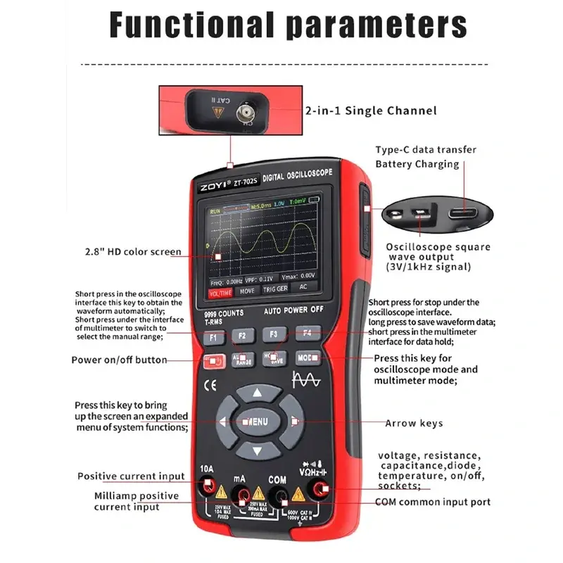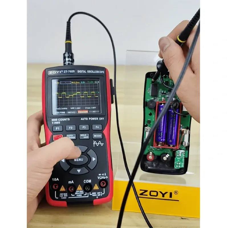 ZT-702S 3-in-1 Digital Multimeter Oscilloscope & Signal Generator, 1 Channel 50MHz, High-Precision Voltage Meter, Auto-Ranging, AC/DC Current Capacitor Resistor Diode, 9999 Counts, 3400mAh Battery